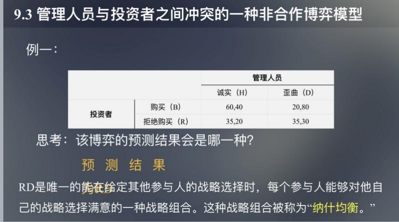 会议伊始,由徐健皓学长分享“冲突的分析”。他将本章内容划分为七个部分进行讲解,主要内容有博弈论、管理人员与投资者之间冲突的一种非合作博弈模式、合作博弈的一些模型、代理理论对会计的意义、有效证券市场理论和经济后果的协调。博弈论基本分为两种:合作博弈与非合作博弈。本章中运用非合作博弈模型,将投资者与管理者对待财务报表的不同情况模型化,不同主体运用财务报表的作用大相径庭,从而双方产生冲突。运用非合作博弈模型,最终可以找到投资者和管理者双方能够双向满意的一种战略组合。