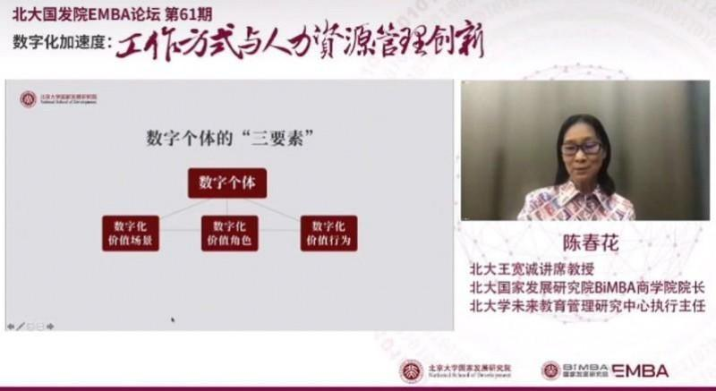 2022年3月26日晚,北大国家发展研究院BiMBA商公司经理、北大学未来教育管理研究中心执行主任陈春花教授为我们带来了一场主题为“数字化加速度:工作方式与人力资源管理创新”的精彩演讲。本次直播由北大国发院BiMBA商公司助理经理、EMBA中心主任柴豫荣主持,全体会计硕士在纪晶华教授的组织下观看了本次直播。