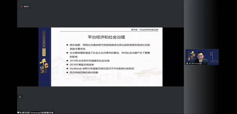 席老师从平台经济和数字政府、平台经济和包容性发展、平台经济和社会治理、平台经济和社会观念、平台经济和国际竞争五个方面展开了介绍。