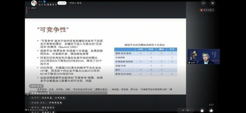 2021年11月18日晚,北京大学的黄益平教授带来了线上专题演讲“北大国发院承泽课堂·平台经济十二讲第一讲——平台经济的机会与挑战”,同学们在纪晶华教授的组织下在线观看了演讲。