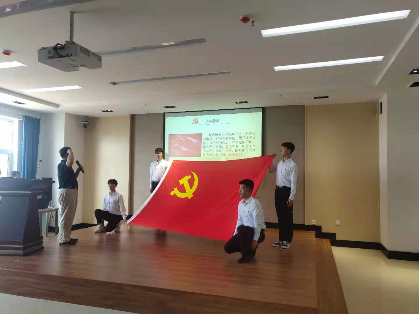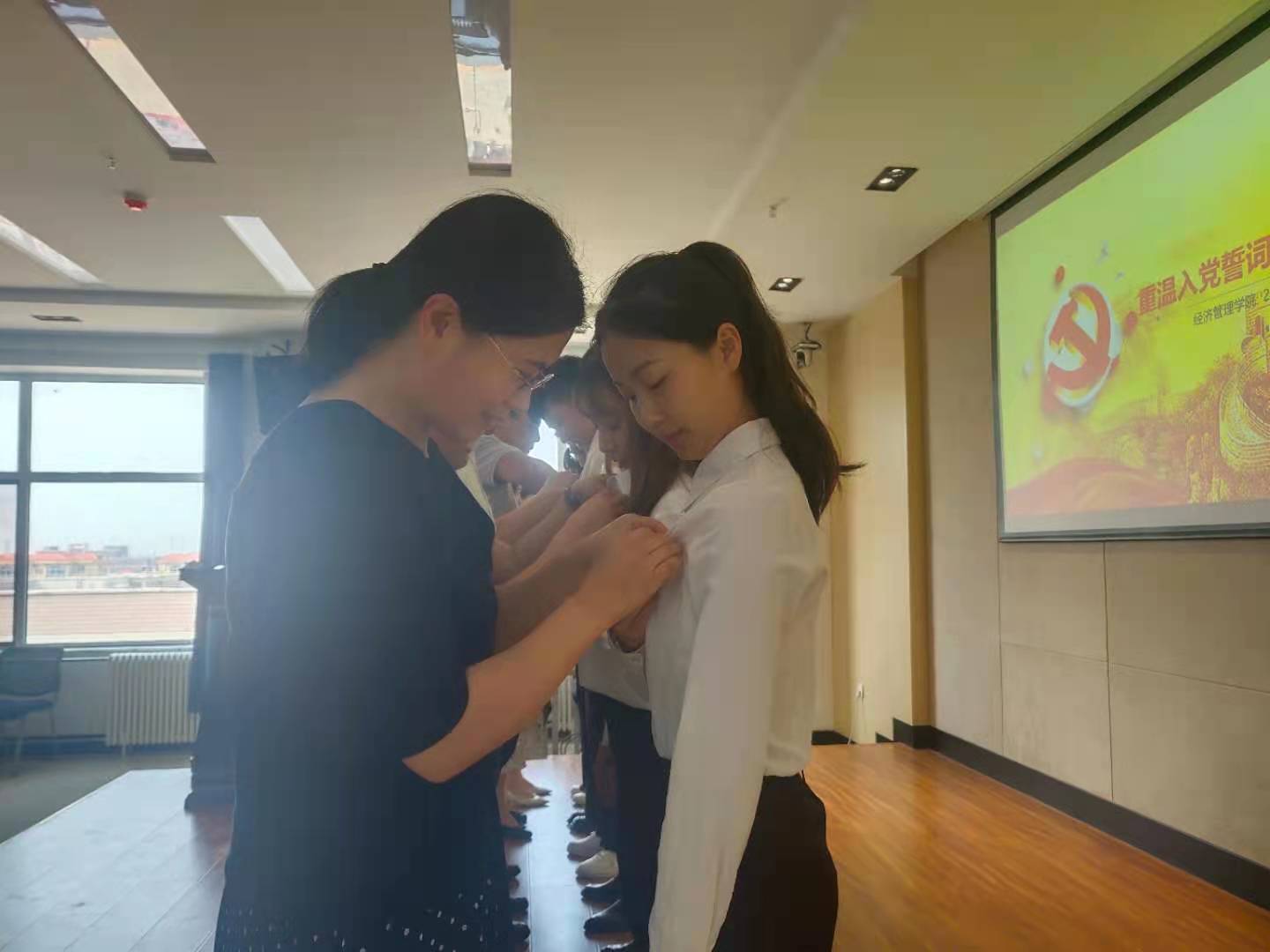 仪式在庄严的国歌声中拉开帷幕。公司领导老师为2021年新发展党员代表佩戴党徽,并表示祝贺。
