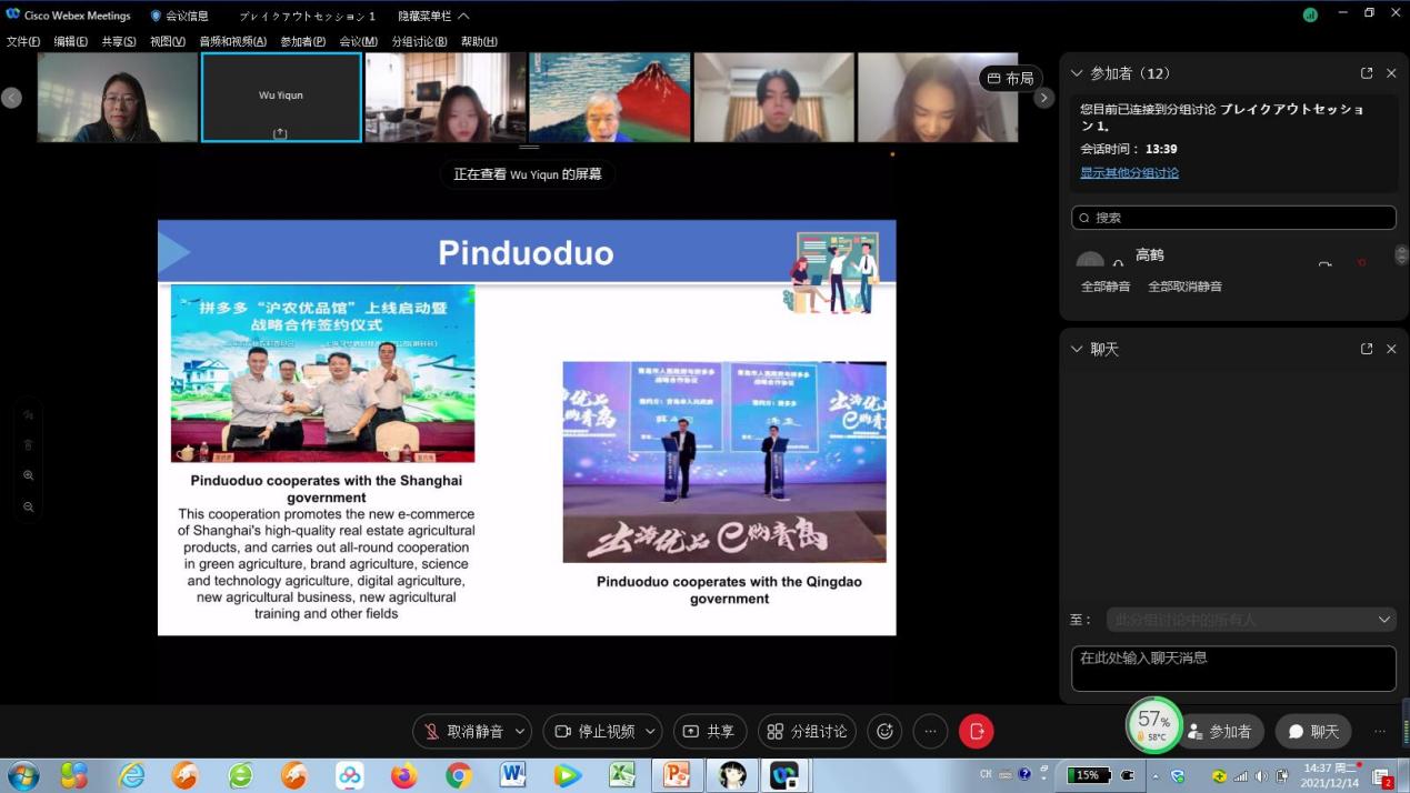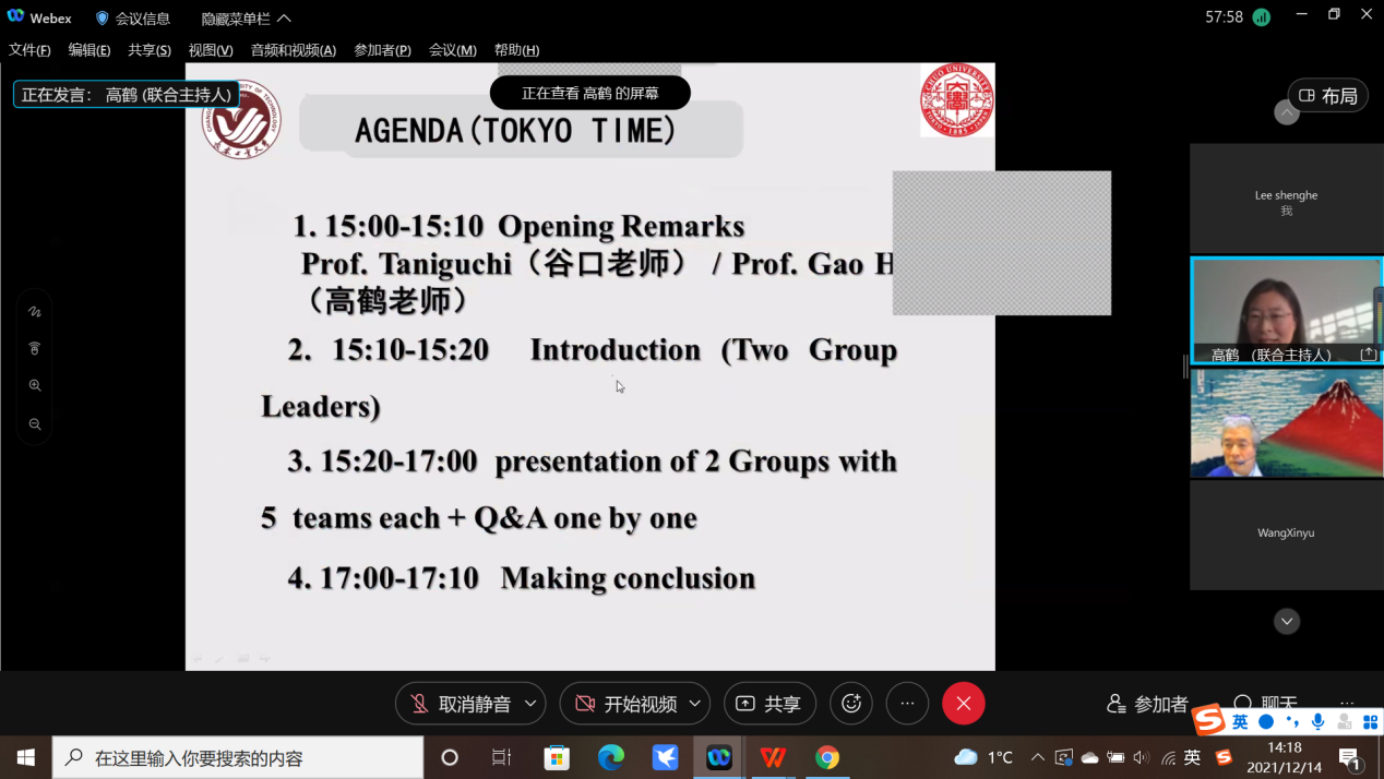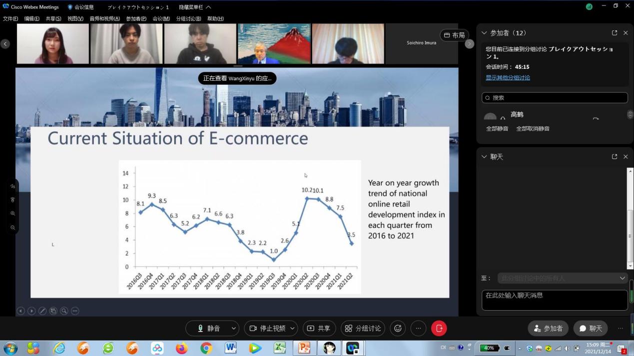 北京时间12月14日下午1:30,经济系高鹤老师带领2019级国贸专业员工团队与日本中央大学经济学部谷口教授指导的三年级研讨小组在Webex平台欢聚一堂,第二轮第二场中日本科生线上学术交流会如期开展,这也是两位老师第二次联手举办的系列国际交流活动,取得圆满成功。