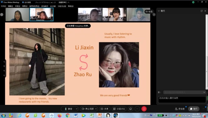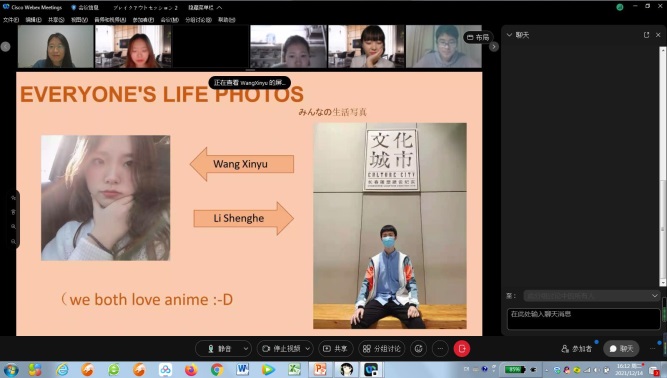 谷口老师和高鹤老师在分组发表期间认真聆听并参与提问和讨论,使得双方同学们收放自如,线上交流氛围轻松热烈。全部交流结束时,大大超出了预期时间,持续了将近3个小时。谷口老师再次肯定了本次交流活动取得的圆满结果,高鹤老师对十个队伍的发表进行了点评和总结。双方师生互送新年祝福,互发邀请,期待明年再次相见。