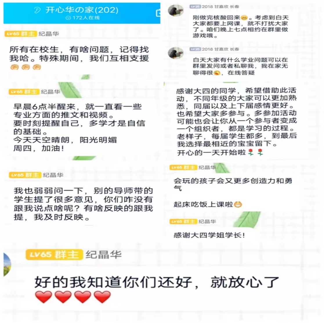 虽然现在疫情肆虐,但是更能体现出我们这个家的团结与温暖。哥哥姐姐在百忙中抽出时间与我们互动娱乐,没有不耐烦,没有应付了事,只有对我们无限的包容与宠爱。纪老师时时关心着我们,在生活上给予了莫大的帮助。每日醒来都能看见一句积极向上,充满朝气的励志话语,一整天拥有好心情,元气满满并勇敢地面对疫情所带来的任何困难。