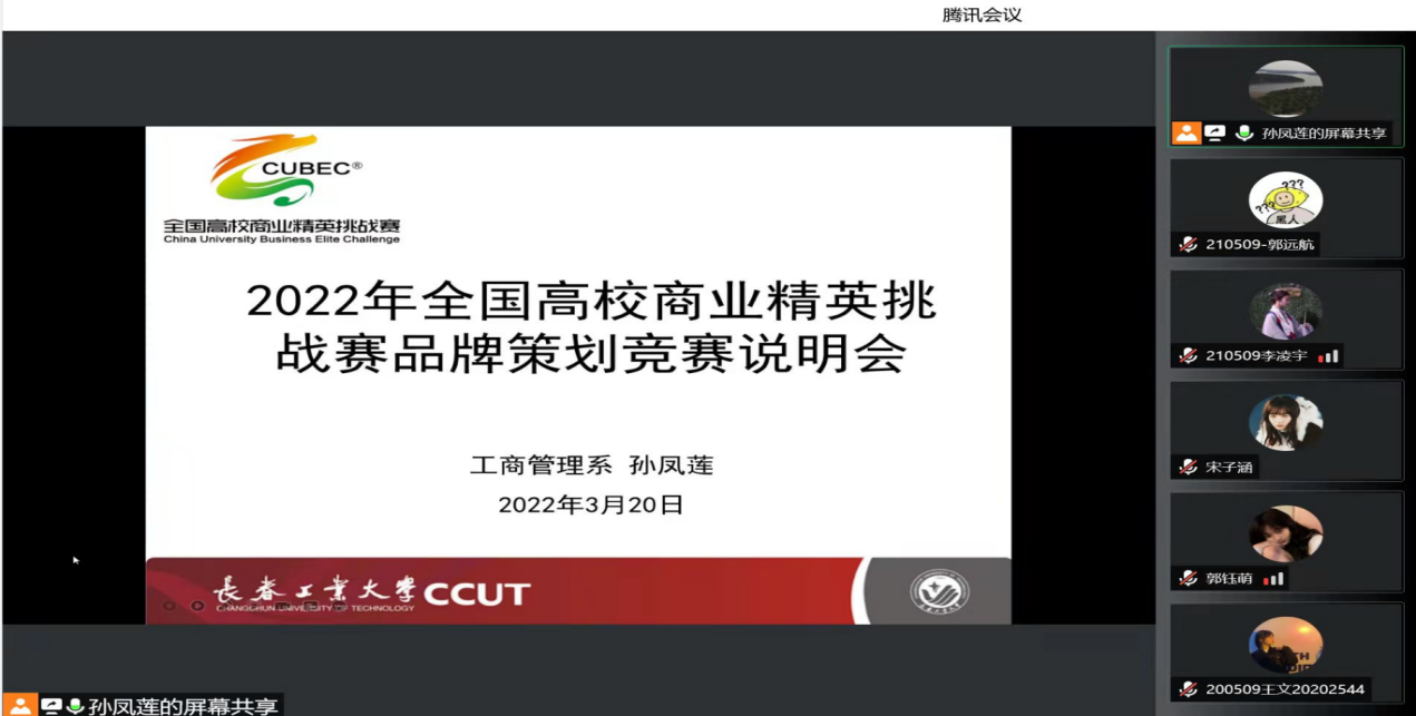 全球品牌策划大赛是以工商管理、市场营销、国际贸易等管理类与经济类专业的高校在校生为主要参赛对象的一项国际性赛事。它以实际企业的产品为依托,基于产学合作模式,采取团体赛形式。参赛选手参加在线知识测评,最终将根据成绩排名选拔出代表公司参加品牌策划竞赛的参赛团队。本次校内选拔赛由工商管理系孙凤莲老师负责指导,工管经理人学社副社长吴雪林同学负责组织实施。确保在疫情防控的大前提下,能够借此机会丰富同学们的隔离生活,拓宽知识视野。在知识竞赛的考试比赛后,3月20日晚上六点孙凤莲老师在腾讯会议召开品牌策划赛的说明会。主要从品牌策划书的评分规则、品牌定位的步骤并结合案例为大家进行讲解,对于同学们进一步完善策划书有了很大的帮助。