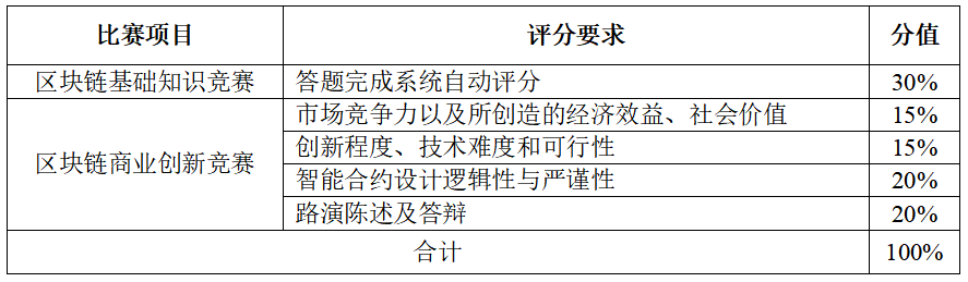 比赛排名根据参赛队总成绩从高分到低分排名(保留小数两位,第三位四舍五入)确定名次;总成绩相同时,以区块链商业创新答辩成绩靠前者为先。