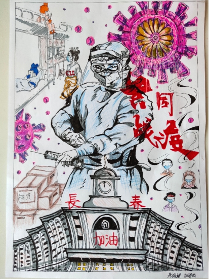 在抗疫过程中,同学们通过各种各样的形式记录学习与生活中的点点滴滴,表达着抗击疫情的精神和对未来生活的期待。190509班的班导师会议中,同学们通过歌曲演唱、音乐弹奏、心得分享、集体舞蹈等才艺表演,彼此间相互鼓励、共同期待未来,以会议为纽带传递友情与祝福。20级同学们用纸笔书写抗疫勇气、用书画表达必胜信念,向坚守岗位、奋战一线的医务人员、防疫工作者表达敬意,感恩抗疫英雄和人间温暖,以画传情、“艺”起抗疫。200510班孙嘉骏、200511班杨明昊与200514班聂小普同学一起作为导演联合制作了抗疫短视频,记录了同学们在抗疫过程中学习与生活的各种细节,通过志愿者活动、员工在线听课、员工课余生活等情节表达了同学们抗击疫情的决心、行动和对疫情之后生活的期望。
