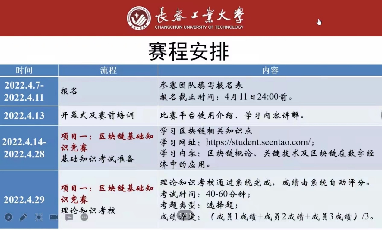 崔老师系统介绍了比赛形式、比赛平台、比赛环节以及赛道形式,并以航空理赔为例,详细阐述了如何制作区块链技术应用创新方案,使参赛选手了解了区块链技术在解决行业痛点中的实际应用。崔老师还介绍了比赛练习期间的注意事项、赛事评分细则及成绩计算、奖项设置,并向同学们演示了赛事平台的具体操作流程。