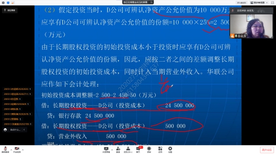 金花玉老师主授《中级财务会计》,疫情阻挡了我们线下共同成长一起学习的脚步,却无法阻止知识的传递。金花玉老师讲课生动活泼有声有色,善于引导员工思考,让枯燥乏味的专业课知识通过案例引导分析后变得易于理解。网络为媒,板书为介,为保证网课讲授效果,在讲述例题时,金花玉老师在ppt上进行圈画,复杂的知识在老师标明重点后浅显易懂,使上课员工快速抓住要点,提高上课效率。金花玉老师富于启发性的授课方式,让抽象难以理解的知识,多层次多角度直观形象地展示在了员工面前,激发员工学习热情,大大提高课堂效率。