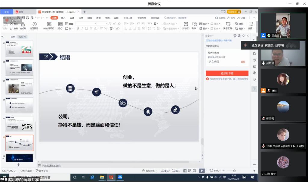 凝聚员工力量、传承经管文化、学习榜样精神、助力学子成才,2022年5月20日18:30,员工论坛2022年第3期在腾讯会议端举行,304永利集团2018级MBA员工赵思瑞作了题为“创业管理实践”的报告。经理张玉智、部分教师、研究生及本科生参加了论坛。论坛由副经理黄鑫昊主持。