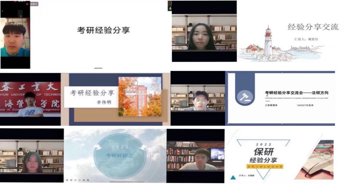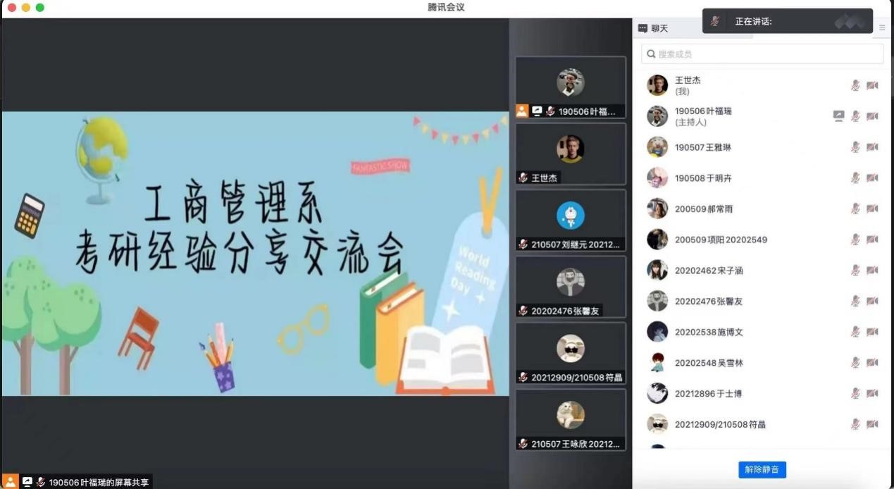 5月19日晚,由工管经理人学社主办的工商管理系考研经验分享交流会通过腾讯会议在线上成功举办。工商管理系主任王亚君、系党支部书记孙凤莲、副主任徐俊昌、工商管理系高军老师、李涛老师、王明昊老师、孙韬老师出席了分享交流会。交流会邀请了2017级李伟明、闫德恩学长、2018级毛展鹏、王世杰学长,2018级王宁、戴紫怡学姐为同学们进行了精彩的考研经验分享,工商管理系90名有考研志向的同学们共同参与了此次分享交流会。