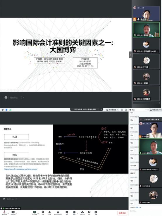 截止目前,《国际会计》课堂上共进行了两次文献汇报,大家各展风采。5月12日进行首次文献汇报的两个小组各有特色,从不同的角度切入。第一小组侧重于“述”,借助手绘图进行汇报,帮助大家理清文献思路、掌握文献全貌。第二小组侧重于“评”,向大家展示自己对此篇文献的所思、所想。5月19日进行了第二次文献汇报,这次的文献汇报有更多的小组成员积极参与到线上汇报环节中,从“幕后”转向“幕前”,让更多小组成员有线上展示的机会。同学们对这种文献汇报方式非常感兴趣,云端教室里的氛围轻松,同学们热情洋溢,课堂充满活力。李佳蔚老师也会对报告进行点评,在鼓励的同时,她也会给员工们提供一些小建议。线上心连心 教学永不停,文献汇报的展示仍在进行中。每名同学在小组中都扮演着不可或缺的角色,将在《国际会计》的课堂上展现出独属他们的风采与魅力。