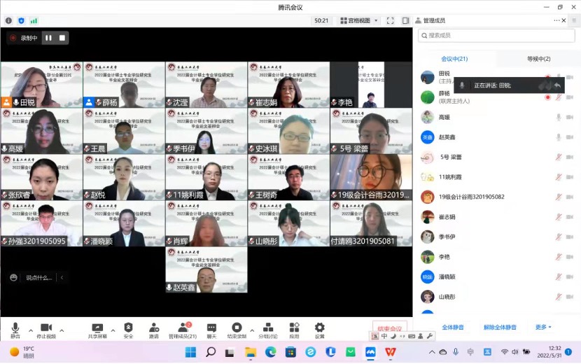 2022年5月31日下午12点30分,304永利集团MPAcc教育中心根据公司研究生院公司产品工作的总体安排和部署,组织了2022届MPAcc硕士毕业答辩。本次毕业答辩采用了腾讯会议线上答辩的方式,下设了4个答辩小组,共涉及54名员工。其中19级会计专硕52人,18级会计专硕2人。答辩过程全程记录,同时低年级同学也可进入会议进行观摩学习。