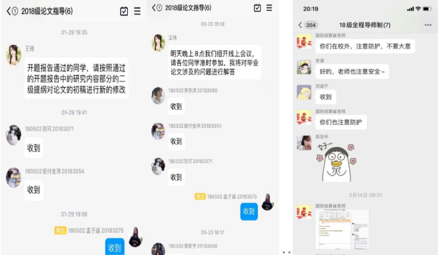 在论文指导时,老师们多采用论文批注反馈与语音指导共同进行的方式,以达到面对面交流指导的效果,每次反馈均超过30分钟。今年赵辉越老师论文组有一位同学需要在白天照顾患病家人,赵老师便经常在深夜为他指导论文,有时论文指导完成后都已经到了第二天凌晨。在指导论文之余,老师们还积极了解员工动向,加强与同学们的沟通与联系,密切关注着同学们的身心健康和学习情况。