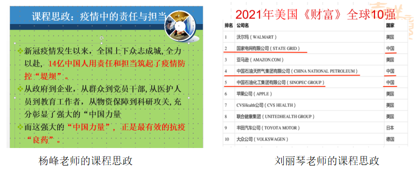 经济系的老师在授课时,将教学内容与课程思政紧密结合。例杨峰老师在讲解《财政医疗卫生支出》时,恰当融入“疫情中政府、医护人员和教育工作者的责任与担当”思政元素,培养员工责任感和勇于担当的精神。刘丽琴老师讲授跨国公司发展时,介绍了中国跨国公司的发展历程及在世界上的地位,极大地激发了同学们的爱国热情。