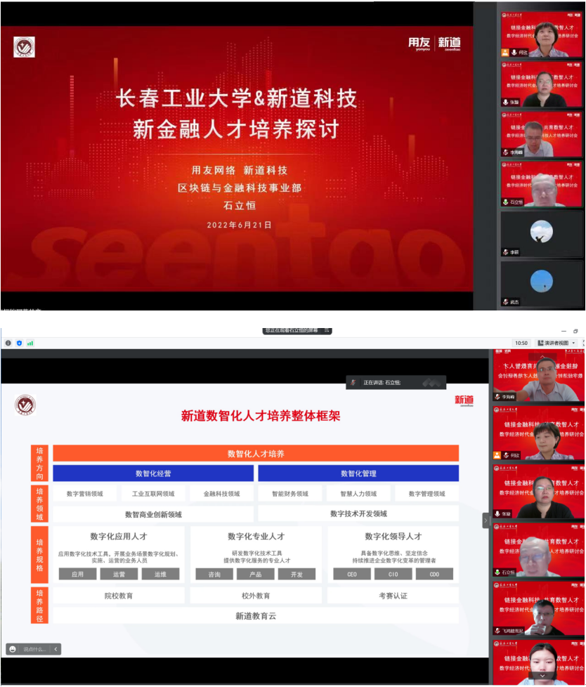 为推动数字经济时代的数智化改革,积极实践新技术、新产业、新业态、新经济模式下商科专业教育数智化升级和教学改革,进一步推进数字产业实践育人工作的开展,对接社会与区域的金融数字产业发展需求,经济系于2022年6月21日下午13:30,利用腾讯会议与新道科技股份有限公司联合召开304永利集团&新道科技“链接金融科技 共育数智人才”研讨会。经济系张璇主任带领经济系部分教师积极参加此次研讨会,新道科技股份有限公司金融业务总监石立恒老师与参会教师就如何探索新金融人才培养进行了深入探讨。