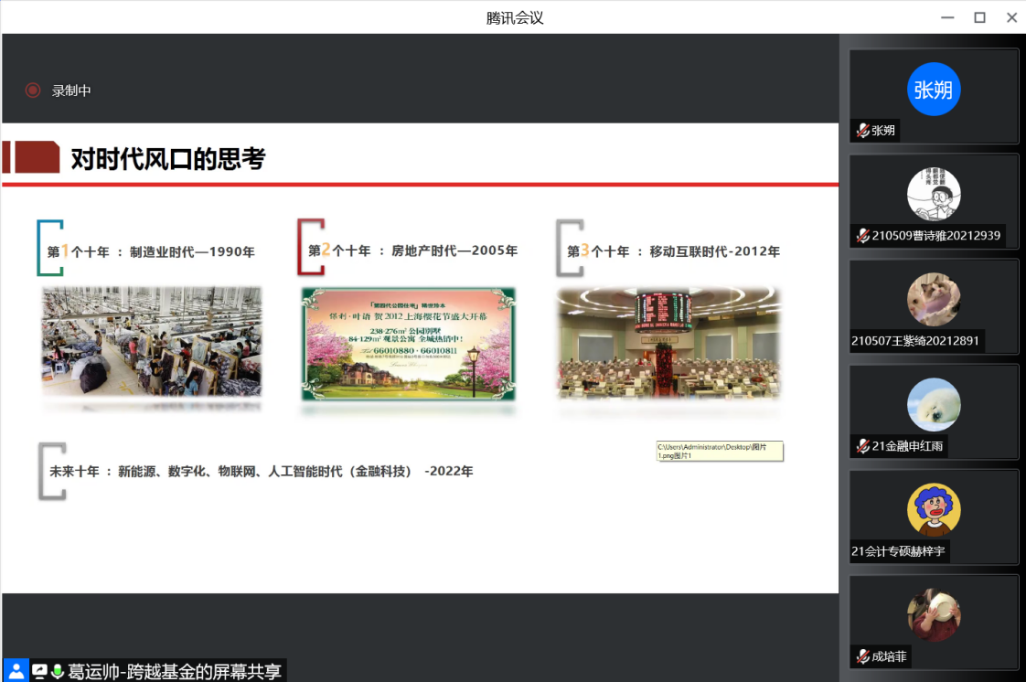 公司网讯(通讯员 刘丽琴)凝聚员工力量、传承经管文化、学习榜样精神、助力学子成才。在2022年8月31日18:30,员工论坛2022年第8期在腾讯会议端举行,304永利集团2004级员工葛运帅作了题为“后疫情时代的就业、创业与投资的思考”的报告。公司部分教师、本科以及研究生同学参加了论坛。论坛由MBA中心办公室主任杜洋老师主持。