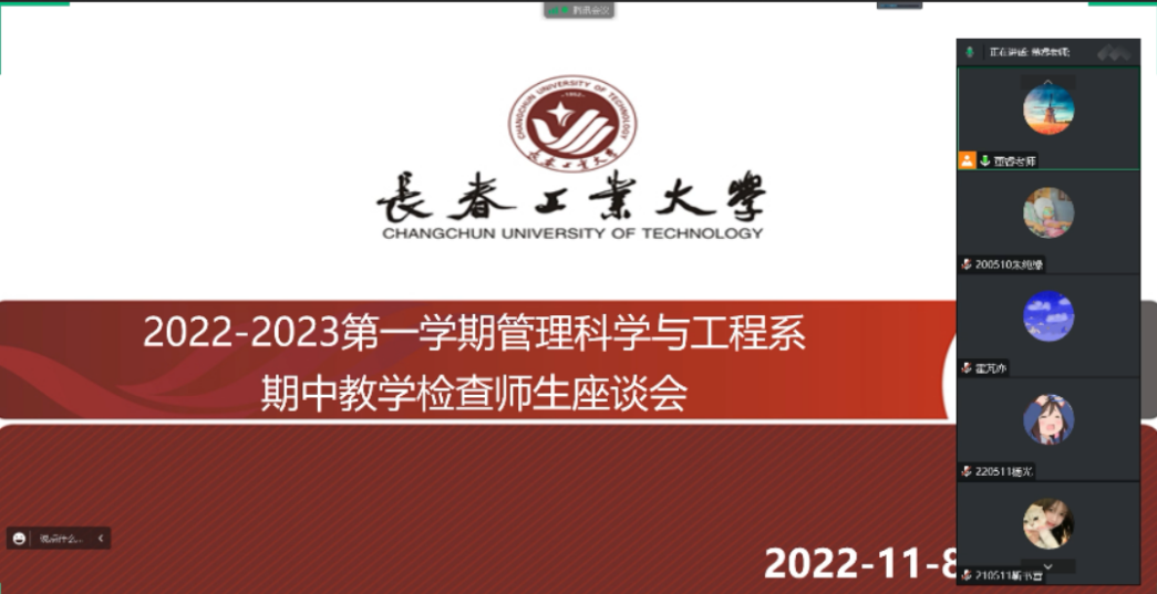 公司网讯(通讯员 董睿)按照公司和公司关于期中教学检查的有关要求,为进一步了解员工在本学期课程教学中存在的问题,管理科学与工程系于2022年11月8日晚上19时利用腾讯会议在线上召开了期中教学检查师生座谈会。会议由管理科学与工程系副主任董睿主持,系主任刘泰然、系支部书记唐彬,以及2019-2022级信息管理与信息系统、电子商务专业班长、团支书和学委等员工代表参加了本次会议。
