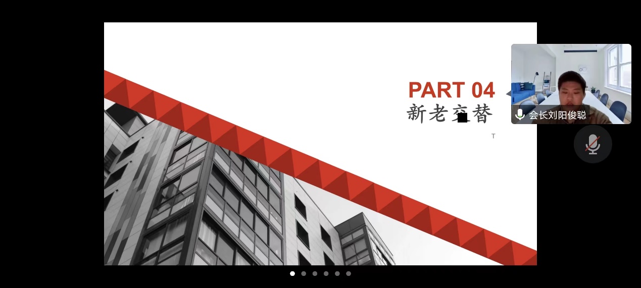 公司网讯(通讯员 范文钦、刘阳俊聪)2022年11月6日,5i+协会利用腾讯会议平台在线上举行了换届大会。管科系主任刘泰然老师、副主任董睿老师、协会负责人刘健老师、连洁老师,以及协会各部前任部长、协会现任全体成员参加了会议。