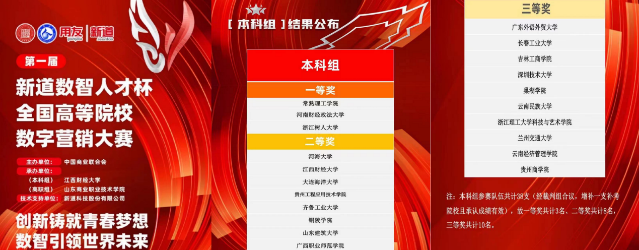 公司网讯(通讯员 赵晨菲)11月19日,2022年“新道数智人才杯”全国高等院校数字营销大赛(营销大数据赛项)经过全国38所高校学子的激烈角逐,圆满落下帷幕。由工商管理系王亚君、王明昊、王迪老师指导的304永利集团代表队在大赛中获得了全国三等奖的好成绩。
