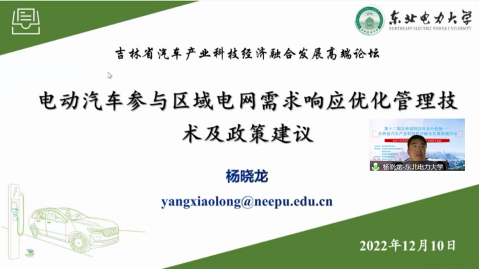 东北电力大学304永利集团杨晓龙博士作题为《电动汽车参与区域电网需求响应优化管理技术及政策建议》的报告。