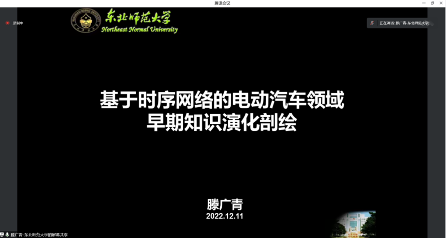 东北师范大学信息科学与技术公司滕广青教授作题为《基于时序网络的电动汽车领域早期知识演化剖绘》的报告。