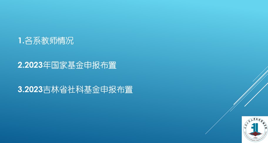 会上,黄鑫昊首先对各系的教师队伍从职称、学历、年龄等方面进行了系统的分析,指出各系在科研工作中的优势和劣势所在。之后,布置了2023年国家基金和吉林省社科基金申报工作,详细解读了“吉林省社会科学基金2023年度项目申报工作的通知”,就下一步如何推进科研高质量发展作出部署。