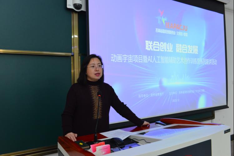 吉林动画公司创新创业公司副经理张加霖,介绍了吉林省高校创新创业(文创类)联盟基本情况、组建宗旨、发展方向和服务对象等。吉动文化艺术集团创意中心总监黄剑锋,以“AI人工智能辅助艺术创作”为题,向与会师生介绍了AI最新技术应用领域、展示了部分艺术创作效果,分析了AI人工智能辅助艺术创作对创新创业教育的影响、导向与趋势,说明了艺术创意在未来产业发展中的重要引导作用。在场师生就最新技术产品、应用限定、训练营管理模式等问题,与嘉宾进行了探讨。