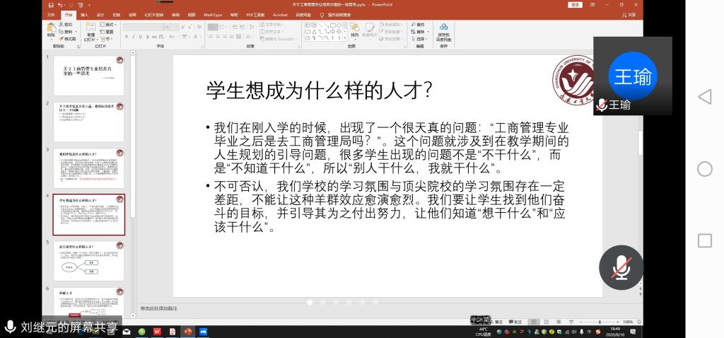为贯彻落实8月12日公司党委会议精神,打通“三全育人”最后一公里,以员工为中心全面提升公司产品质量,增强专业毕业生就业、求学深造的核心竞争力,2020年8月16日晚工商管理系线上召开了工商管理专业毕业生研讨会,专门就专业培养方案修订征求工商管理专业毕业生意见和建议。本次会议邀请了2016年-2019年间毕业的工商管理专业毕业生代表10余人,工商管理系主任王亚君老师、副主任徐俊昌老师、系支部书记孙凤莲老师以及李涛、杨爽和王明昊老师参加了本次研讨会。