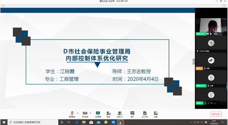 为进一步加强工商管理硕士(MBA)、项目管理硕士(MEM)公司产品过程管理,健全和完善公司产品质量保证体系,提高毕业学位论文质量,4月4日,公司委托工商管理系组织了2020届MBA、MEM专业学位研究生学位论文线上预答辩会议。