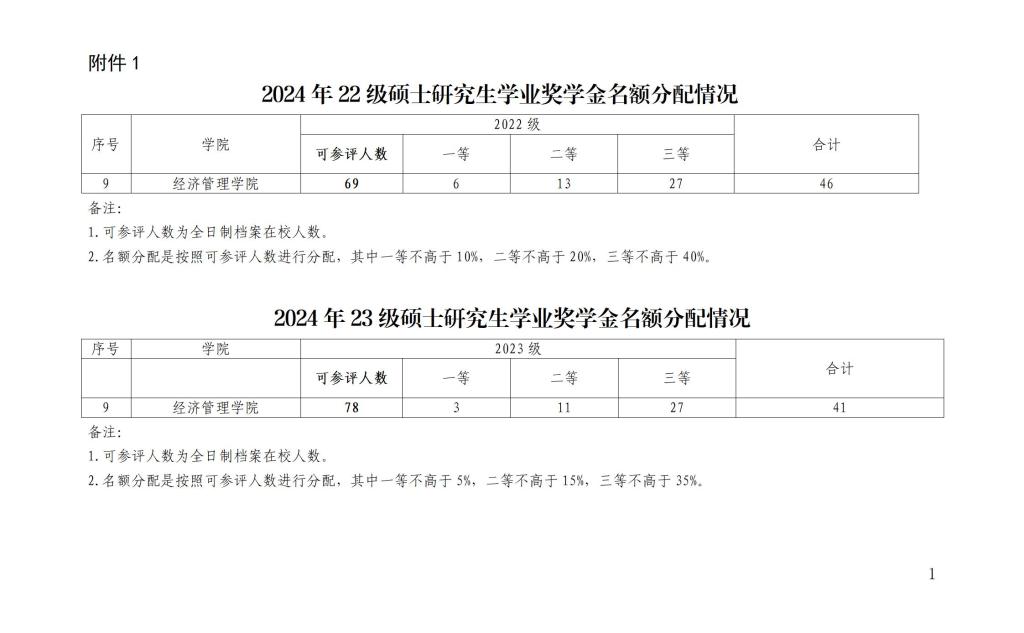 22级、23级硕士研究生学业奖学金名额分配如下:
