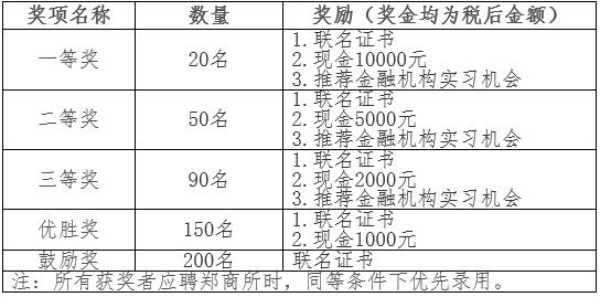 一等奖、二等奖、三等奖的获奖者可获得:(1)郑商所、金融教指委、中期协联合颁发的证书;(2)现金奖励;(3)推荐郑商所、中期协以及其他金融机构实习机会。其中,一等奖奖励税后10000元,二等奖奖励税后5000元,三等奖奖励税后2000元。