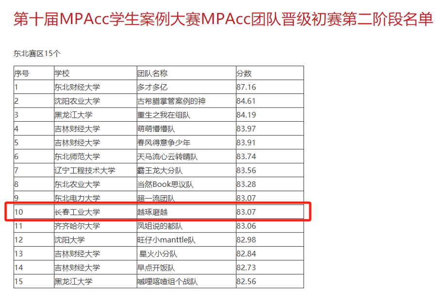 4月23日,大赛组委会公布初赛第二阶段晋级名单中,财会系推选的5支队伍均获得佳绩。推选参赛的研究生团队全部进入东北赛区前100名,推选参赛本科生团队全部进入东北赛区前10名。其中,研究生组“越琢磨越”(队长:曹鹏;队员:张琬宸、秦毓婉、严乙桐、谭惠元、郝文崧;指导老师:刘慧、董晨君)从东北赛区262个报名团队中脱颖而出,荣获东北赛区第9名,进入第二阶段的比赛。